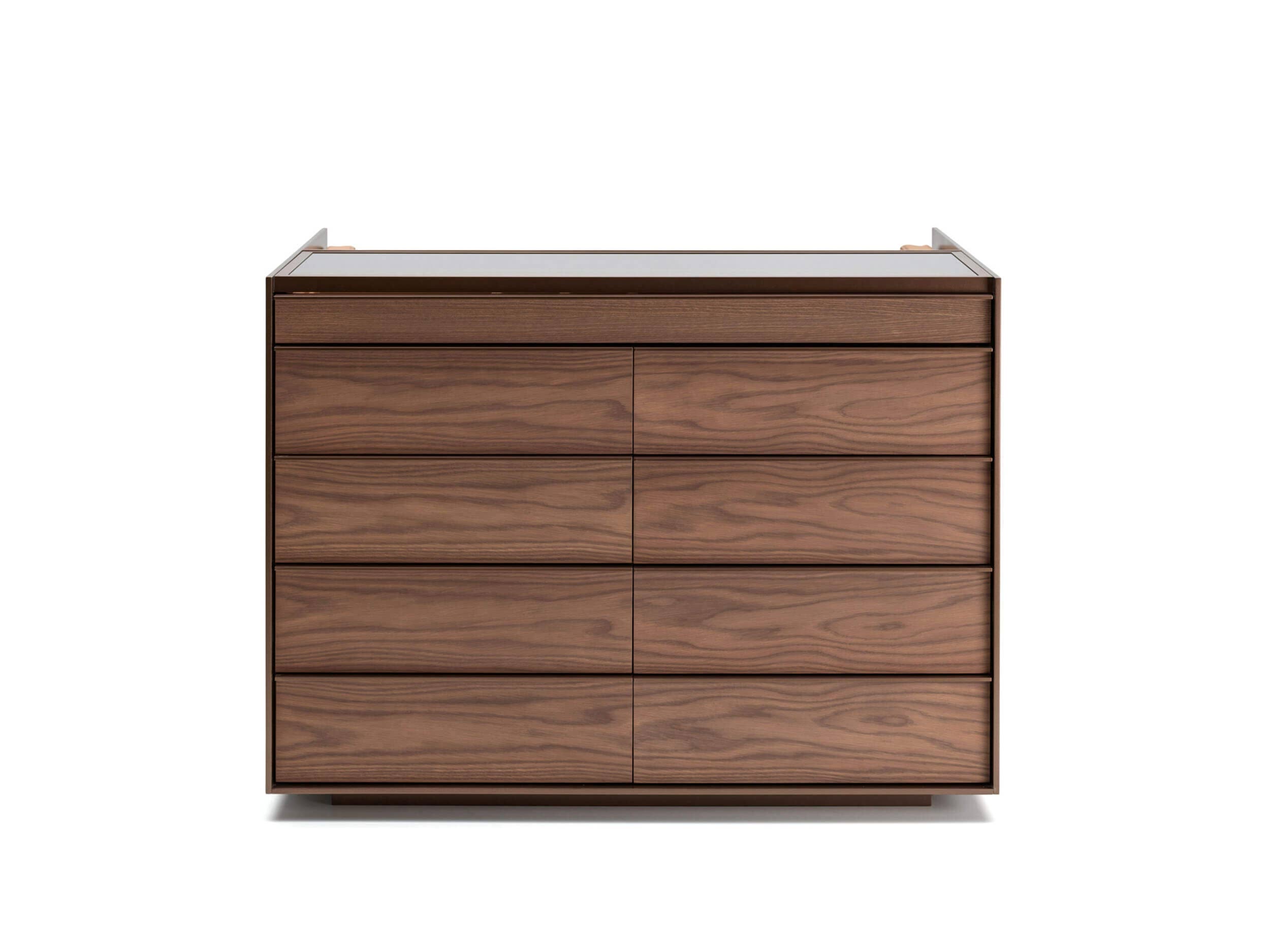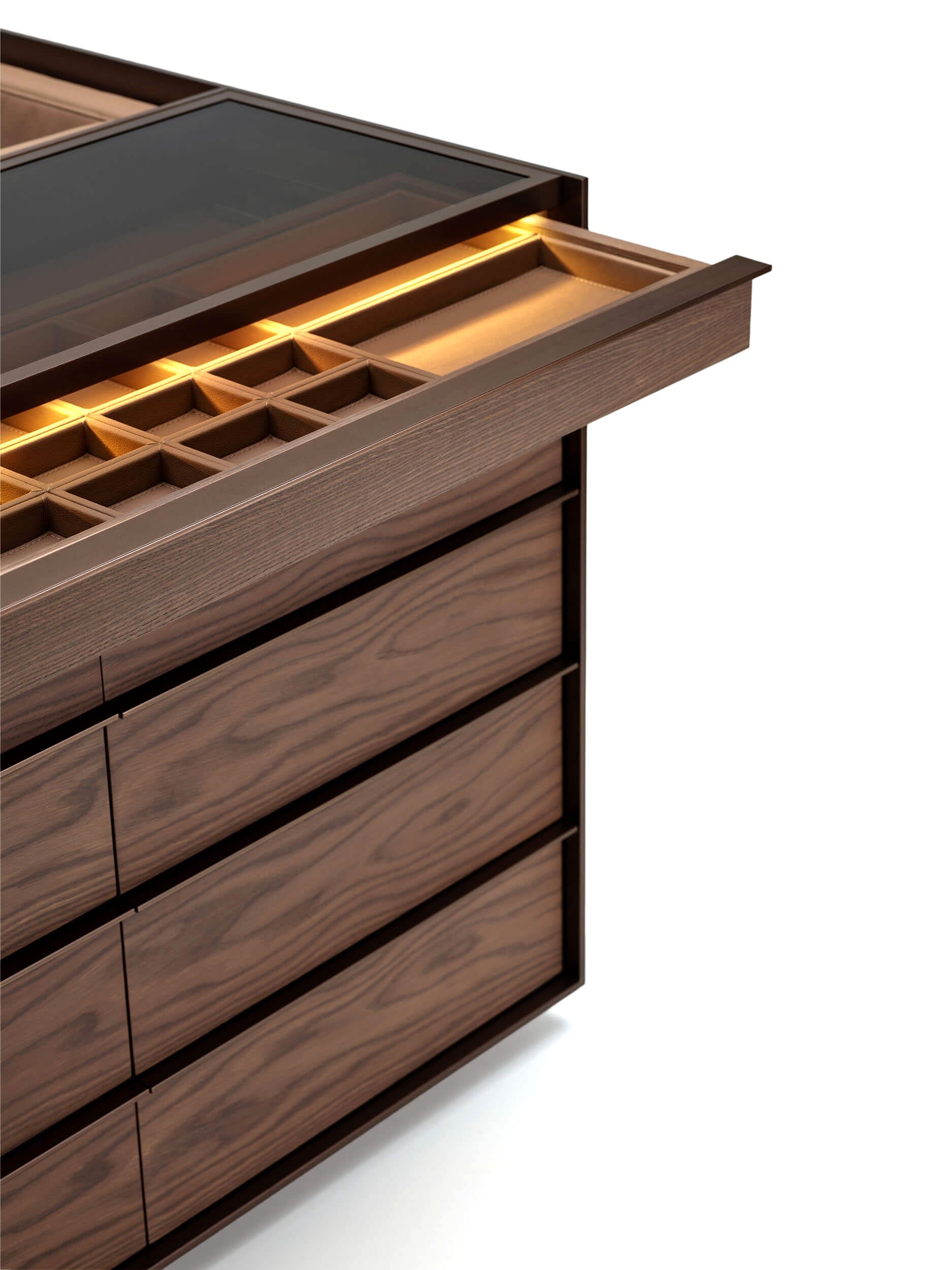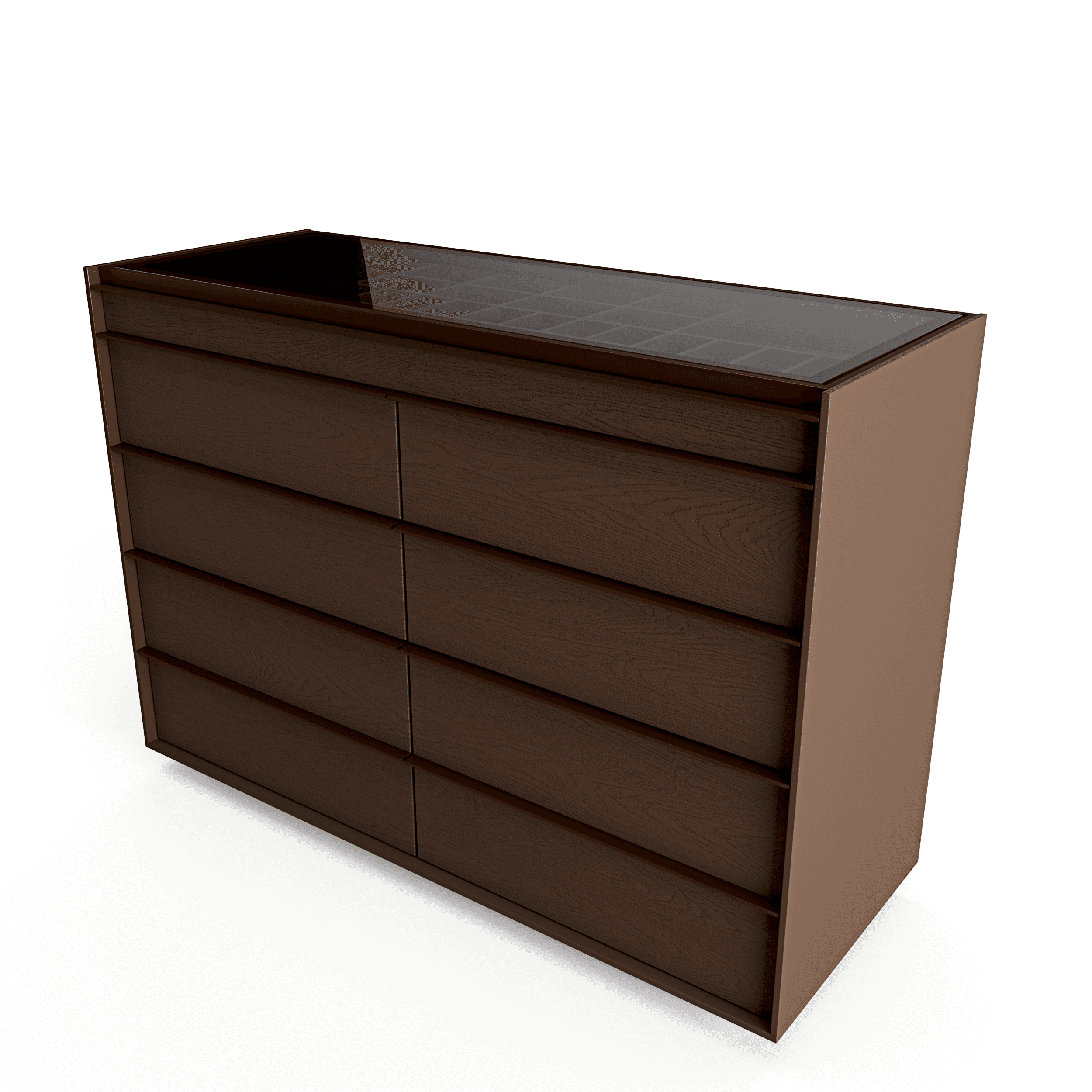 The Glassy chest of drawers features a customizable design that allows users to combine various modules. It Pinco drawers, accessory drawers, a scarf holder,