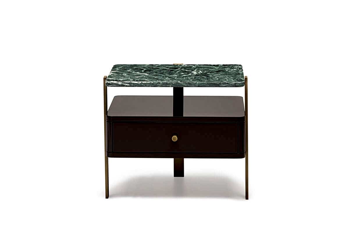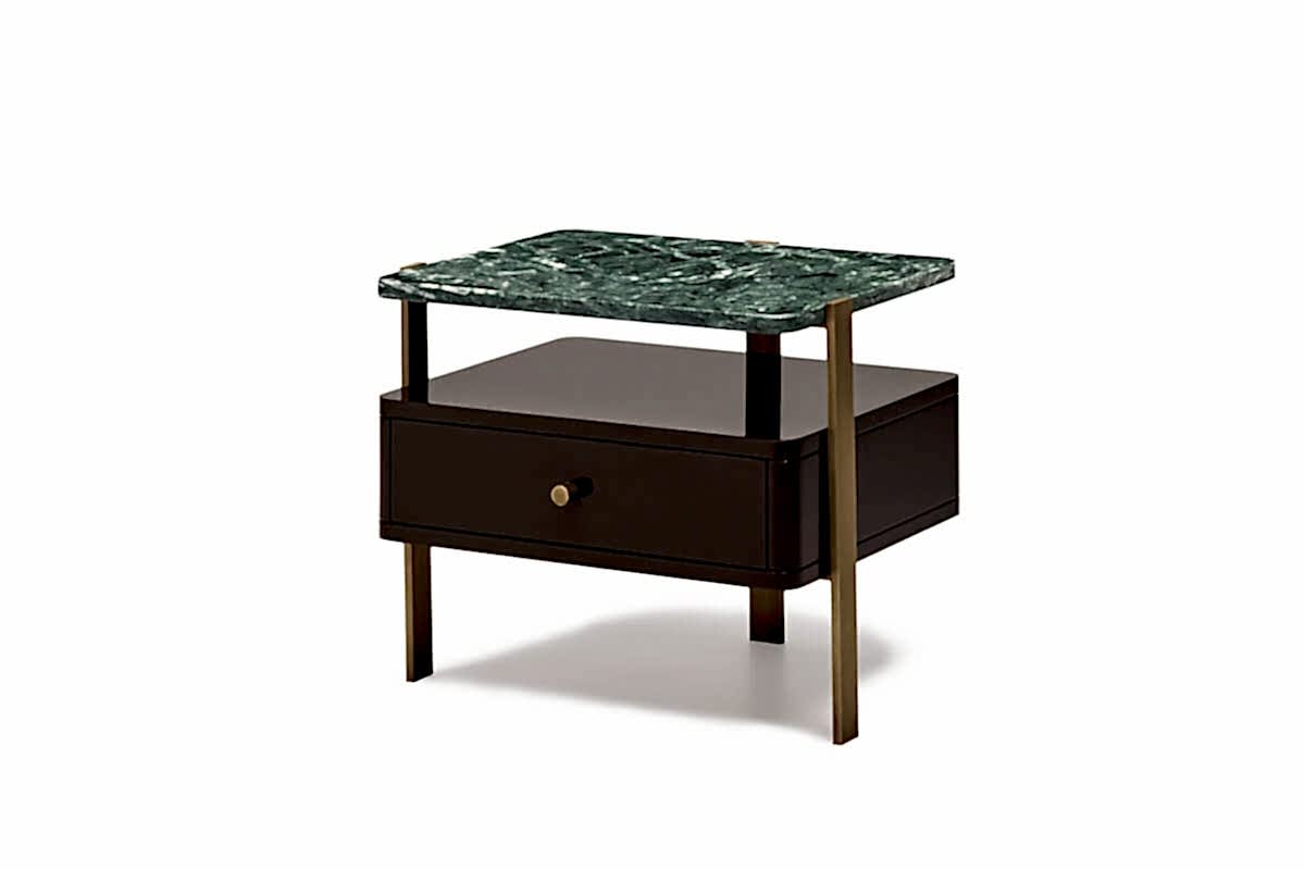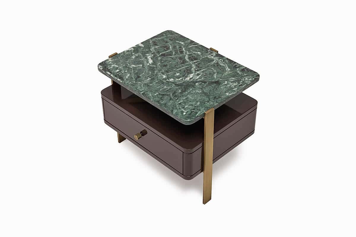 Teo comes to the fore with its Pinco metal leg design and lacquer body offered in bright or matte colors. Various natural stone options are available for Verde Guatemala marble top used at the top of the nightstand. The dresser offers functionality with its top drawer featuring partitions. Besides marble, lacquer material is also available for the top.