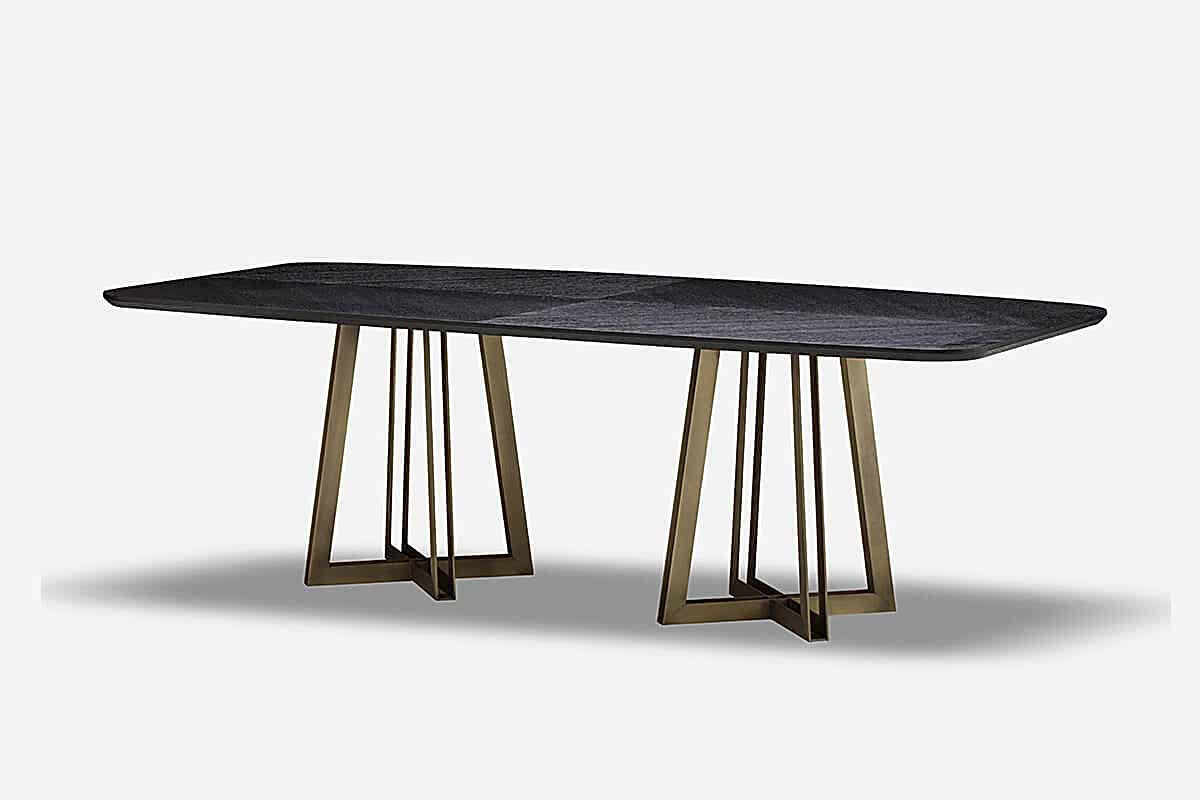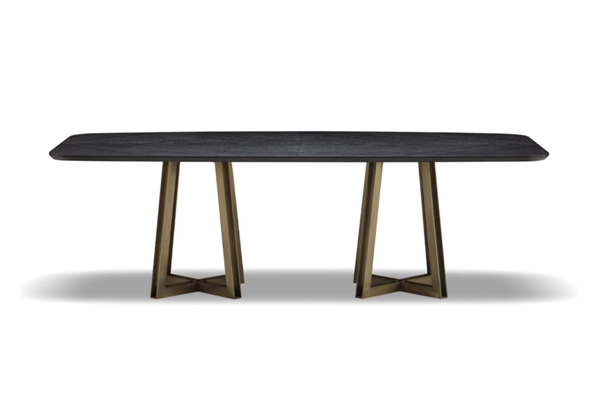 Featuring an oval top on pyramidal metal legs, Cloe is offered in natural wood or natural stone options for an elegant and modern look Pinco by the marquetry work on the wooden table.