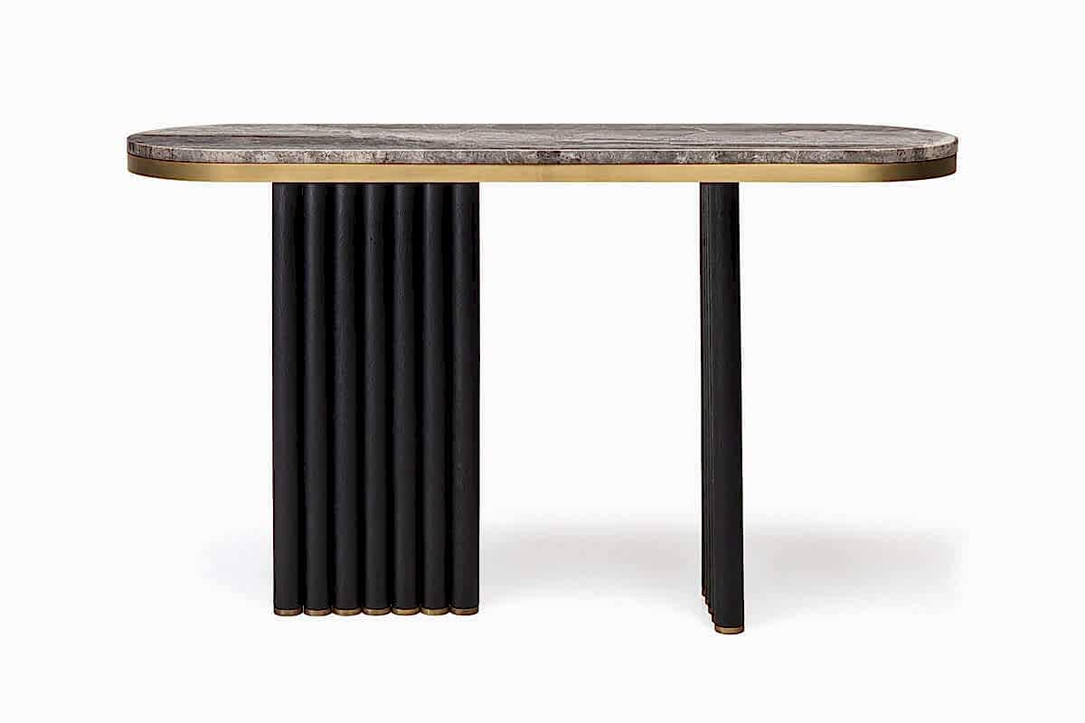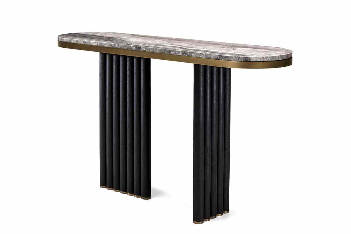 Ahşap torna sıralı Pinco ve yuvarlak formlu mermer tablalı Notte dresuar, mermer, metal ve ahşap malzemeleri birleştiriyor. Farklı doğal taş seçenekleri, antrasit ve brass metallerle kombinlenebilir. Masif meşe ahşap ayaklarda farklı ahşap renk alternatifleri uygulanabilir