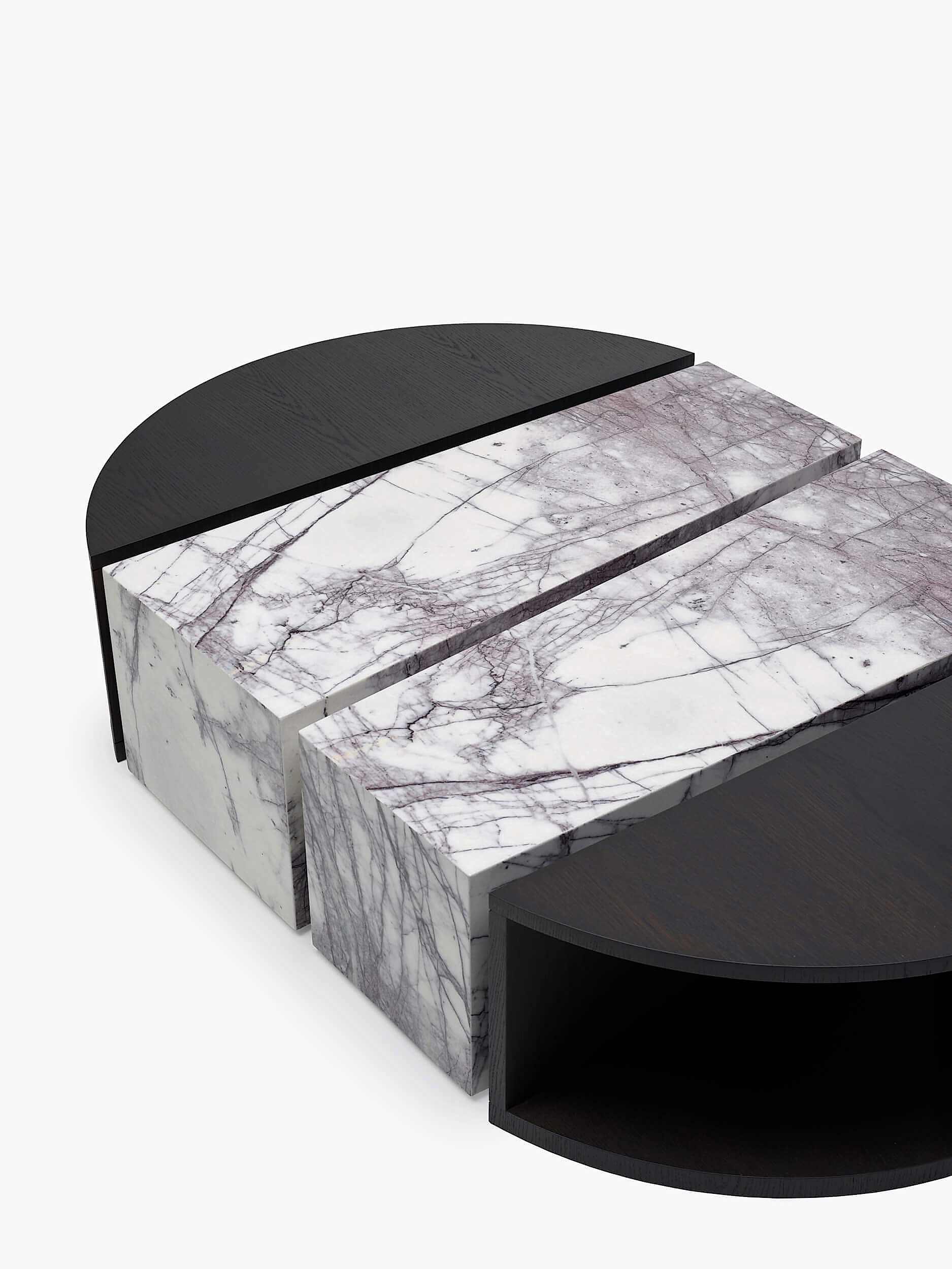 Dilimli çoğaltılabilir tasarımı ile Slice orta sehpa, yaşam alanlarına farklı Pinco sunuyor. Yuvarlak dış parçaları ahşap seçenekleri ile sunulurken, orta modüllerinde ahşabın yanında çeşitli doğal taş alternatifleri de sunuluyor.